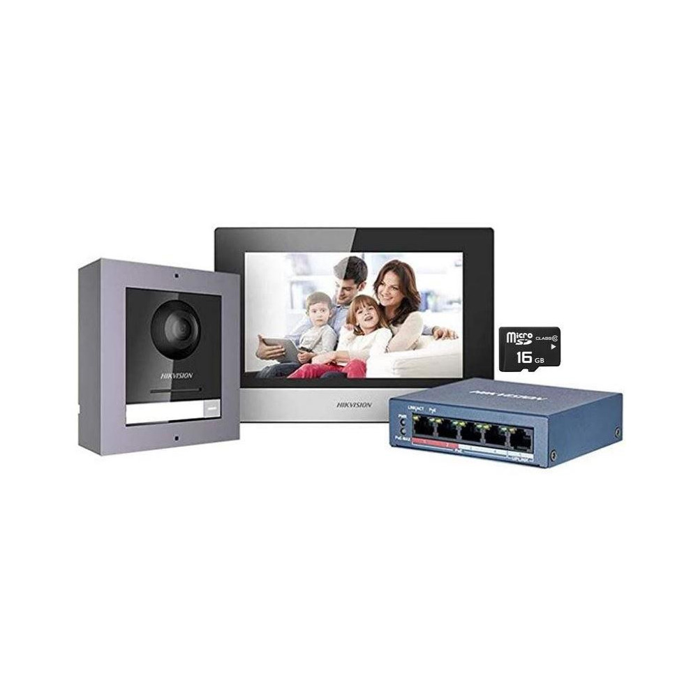 Obsahuje černý bytový monitor DS-KH6320-WTE1, dveřní stanici DS-KD8003-IME1, 4-portový PoE switch + 16GB paměťovou kartu